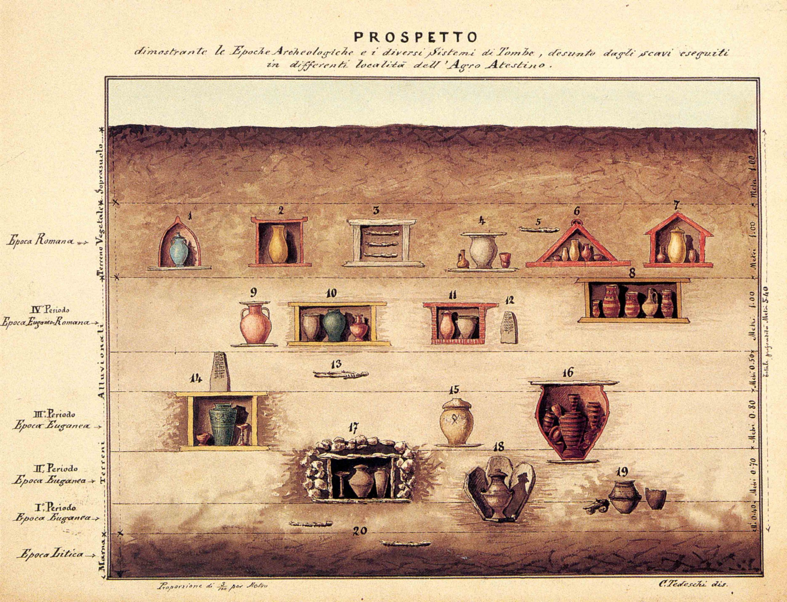 1876: Si scoprirono casualmente, in un podere di proprietà del conte Boldù Dolfin a Canevedo, sette tombe. Due di esse contenevano ricchi corredi e bellissime situle bronzee decorate a sbalzo. Questa scoperta confermò a Prosdocimi l’esistenza a Este di una importante civiltà, da lui in un primo momento definita euganea, sulla quale pubblicò prontamente una serie di studi.